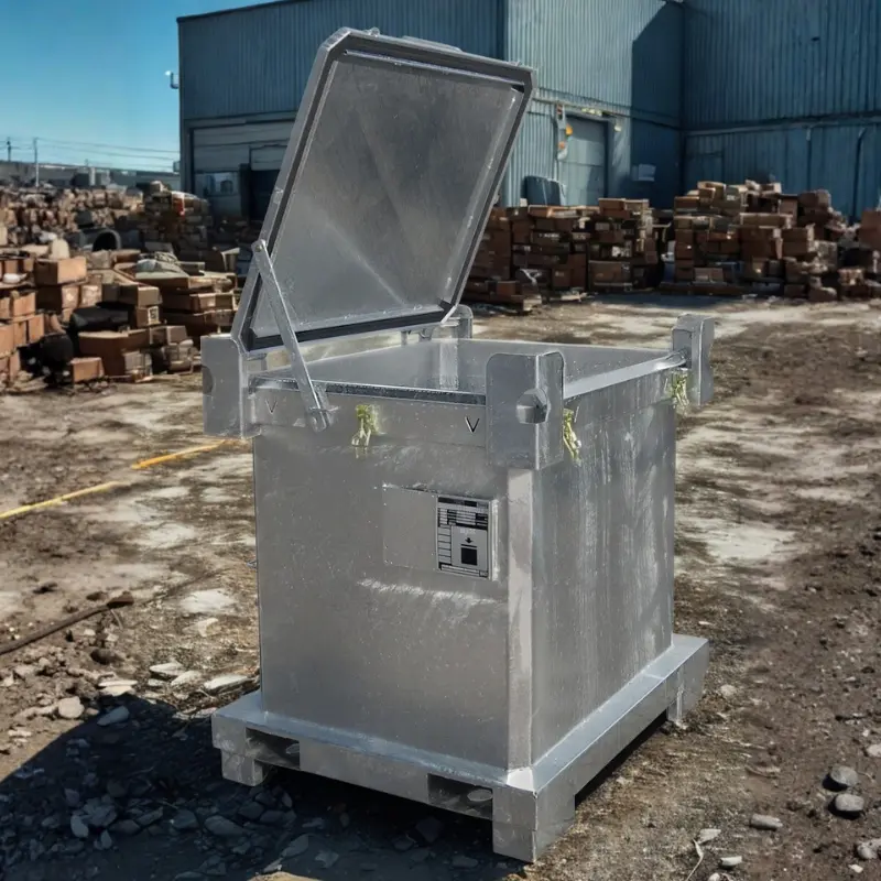 Kontener o pojemności 800 l. Wykonany z materiałów wysokiej jakości. Solidna, wytrzymała, stalowa blacha sprawia, że kontener jest łatwy w czyszczeniu, a ocynkowana ogniowo powierzchnia zapewnia mu długą żywotność.