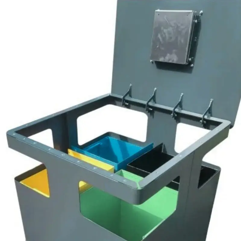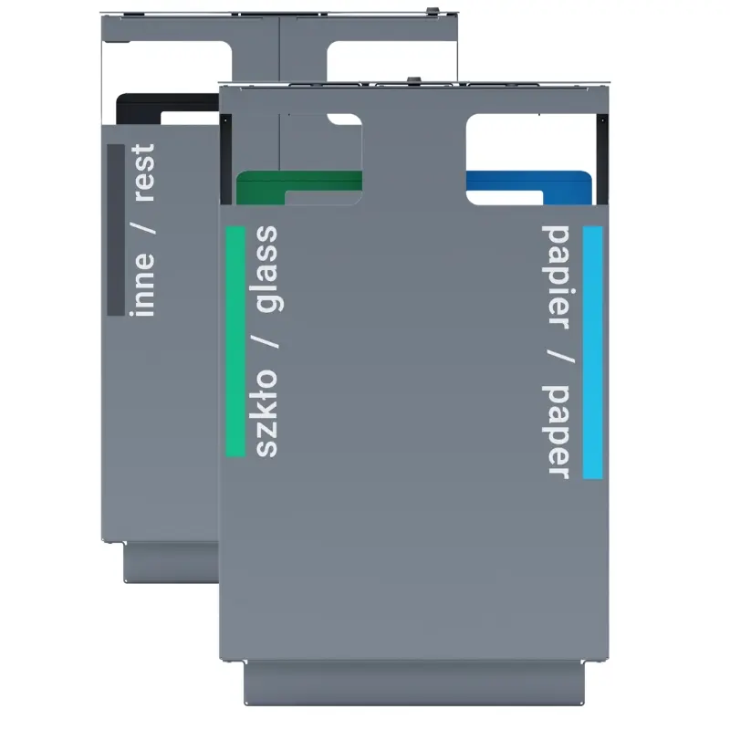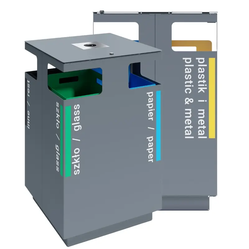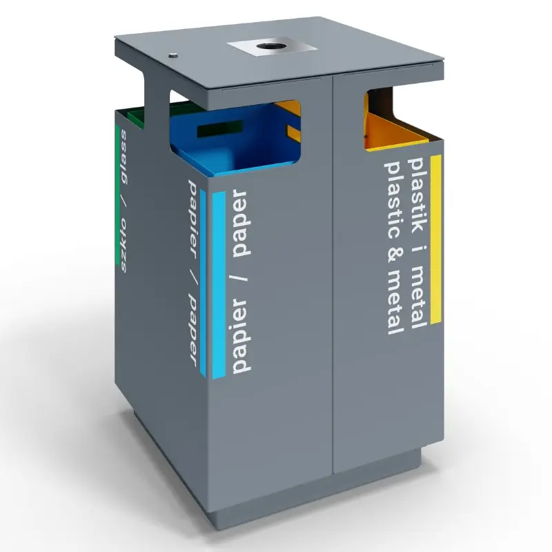 - Malowana proszkowo zewnętrzna obudowa w kształcie prostopadłościanu z czterema otworami wrzutowymi umiejscowionymi na rogach kosza.