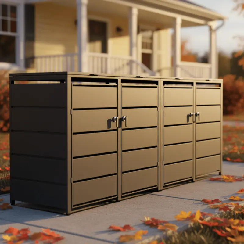 Nasza minimalistyczna obudowa na kosze BIN BOX COVER to odpowiedź na realne problemy związane z przechowywaniem pojemników na odpady. Poprawia ona wygodę użytkowania, a jej uniwersalna, nienachalna kolorystyka świetnie dopasuje się zarówno do nowoczesnych osiedli, jak i bardziej klasycznych aranżacji domów mieszkalnych – bezproblemowo komponuje się z każdym kolorem elewacji, drewnem, srebrnym i złotym wykończeniem metalu. Jedną z jej największych zalet jest możliwość całkowitego ukrycia kolorowych pojemników do segregacji. Wtedy nawet jeśli pojemniki na śmieci są przepełnione, nie wpływają w żaden sposób na wygląd otoczenia. Stabilność obudowy na śmietniki BIN BOX COVER chroni pojemniki przed przewróceniem przez wiatr, czy dzikie zwierzęta, zmniejsza ryzyko uszkodzeń i wydłuża ich żywotność.