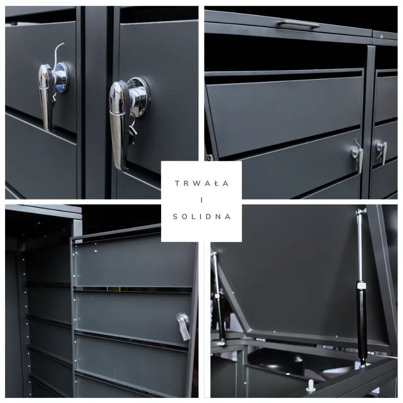 W korzystaniu z tego typu rozwiązań małej architerktury – ogromne znaczenie ma wygodny system otwierania. Klapka podnoszona za pomocą uchwytu zamocowanego na łańcuszkach sprawia, że jednocześnie uchyla się pokrywa pojemnika i zewnętrzna obudowa – dzięki czemu unikamy brudzenia rąk, dotykając pojemnik. Frontowe drzwiczki obudowy na pojemniki komunalne ułatwiają natomiast opróżnianie pojemnika służbom komunalnym oraz pozwalają właścicielowi wysunąć kosz tylko wtedy, gdy tego potrzebuje.