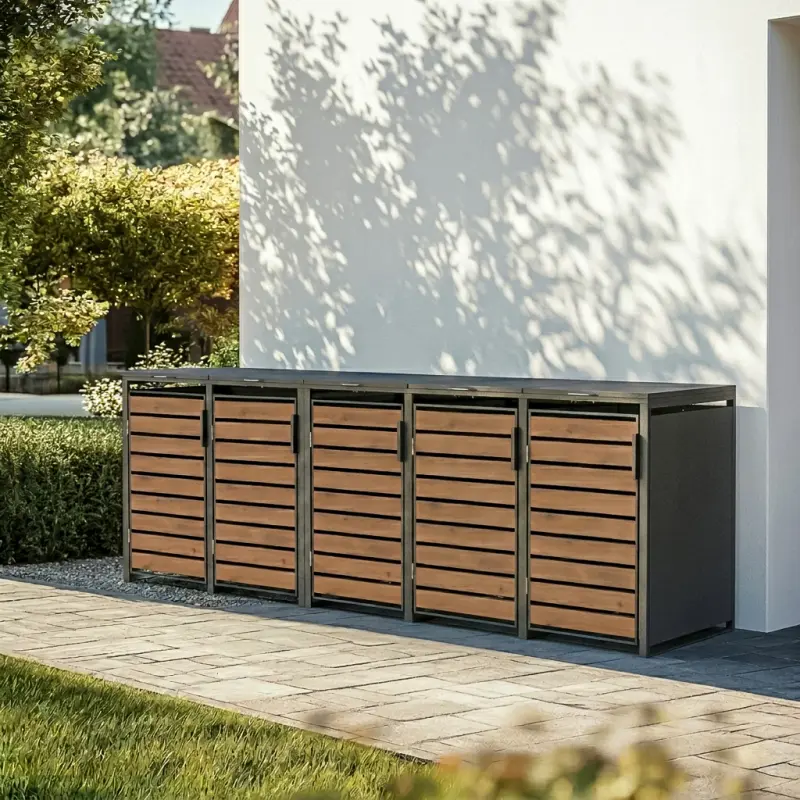 Zmieniaj wygląd swojej przestrzeni dzięki estetycznej obudowie na kosze o pojemności 120 litrów WOOD BOX COVER. To nowoczesne rozwiązanie pozwala ukryć pojemnik na odpady, zachowując przy tym spójny, elegancki wygląd podjazdu, czy bramy wjazdowej. Frontowa część osłony wykonana została z paneli drewnopodobnych w ciepłym, naturalnym odcieniu, które tworzą elegancki kontrast z antracytową stalową ramą. Całość prezentuje się nowocześnie i solidnie – pasuje zarówno do przydomowego ogrodu, jak i do przestrzeni osiedlowych w dużych miastach.