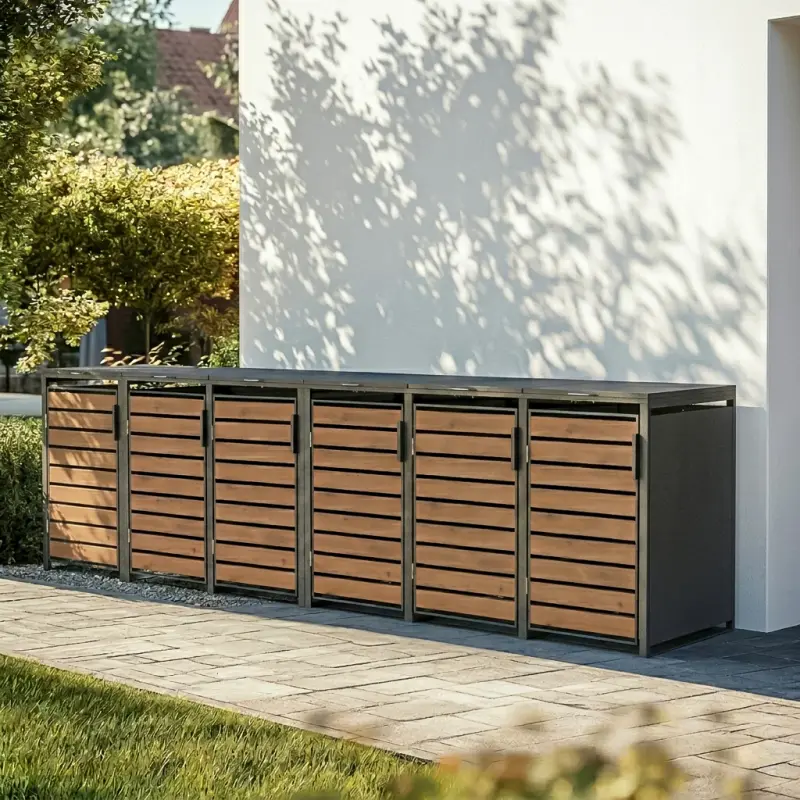 Zmieniaj wygląd swojej przestrzeni dzięki estetycznej obudowie na kosze o pojemności 240 litrów WOOD BOX COVER. To nowoczesne rozwiązanie pozwala ukryć pojemnik na odpady, zachowując przy tym spójny, elegancki wygląd podjazdu, czy bramy wjazdowej. Frontowa część osłony wykonana została z paneli drewnopodobnych w ciepłym, naturalnym odcieniu, które tworzą elegancki kontrast z antracytową stalową ramą. Całość prezentuje się nowocześnie i solidnie – pasuje zarówno do przydomowego ogrodu, jak i do przestrzeni osiedlowych w dużych miastach.