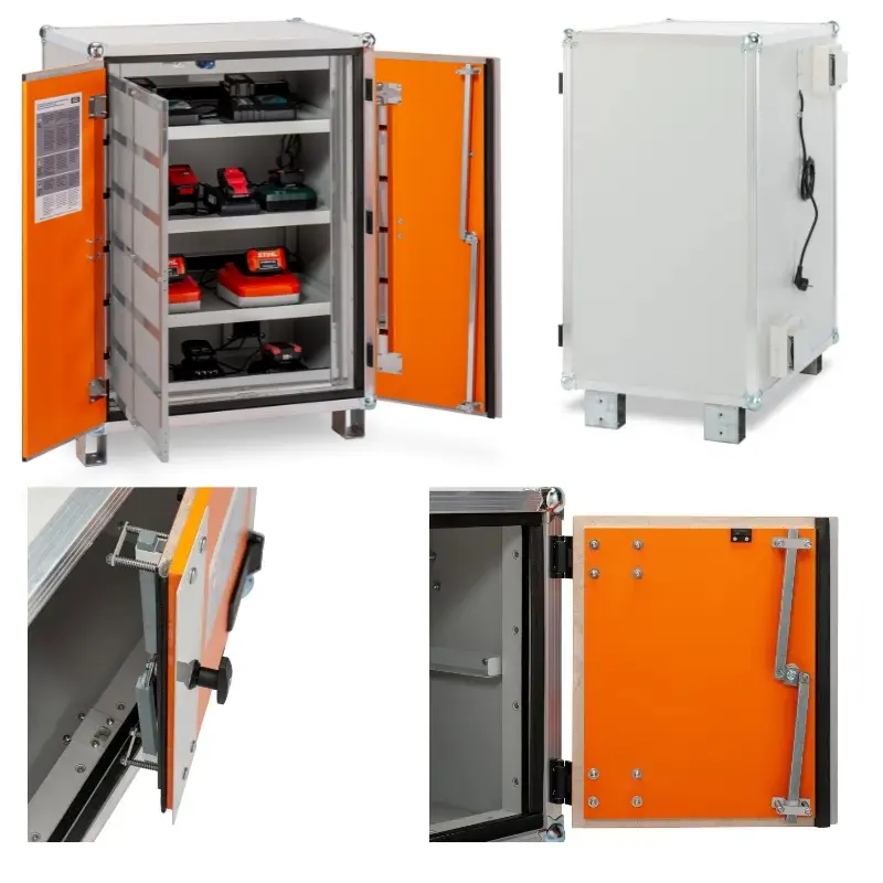 Otworzenie drzwi szafki natychmiastowo przerywa proces ładowania. Ładowanie zostaje także wyłączone w przypadku awarii akumulatora, wykrycia zagrożenia przez czujnik zewnętrzny, a także przy wzroście temperatury powyżej 70°C, kiedy wyłącza się też wentylacja techniczna. Szafa wyposażona jest w 3 półki i uszczelki zapobiegające ucieczce płomieni oraz system dymoszczelny, chroniący przed wydobyciem się dymu. Wyposażona jest też w kratę przeciwpożarową zapobiegającą wydostawaniu się płomieni i odłamków podczas eksplozji. Dołączone 2 czujniki dymu z alarmem akustycznym komunikują się ze sobą bezprzewodowo. Jeden z czujników jest przeznaczony do umieszczenia wewnątrz, a drugi na zewnątrz szafy. Dzięki temu, mimo grubych i solidnych ścian szafy, alarm akustyczny pozostaje słyszalny. Z kolei w przypadku wykrycia zagrożenia przez detektor zewnętrzny, zostanie odcięty prąd ładowania wewnątrz szafki. Solidne zawiasy i zamek zabezpieczają zawartość przed dostępem przez nieupoważnione osoby.