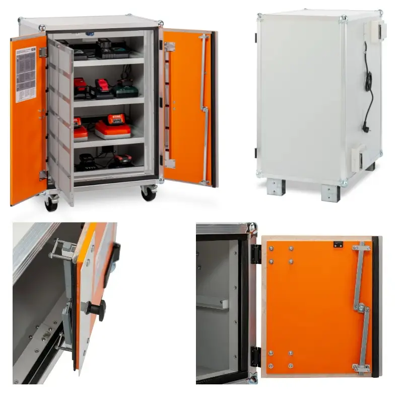 Otworzenie drzwi szafy skutkuje natychmiastowym przerwaniem procesu ładowania. Ładowanie zostaje też wyłączone w przypadku awarii akumulatora, wykrycia zagrożenia przez czujnik zewnętrzny, a także przy wzroście temperatury powyżej 70°C, kiedy wyłącza się też wentylacja techniczna. Szafa posiada 3 półki i uszczelki zapobiegające ucieczce płomieni oraz system dymoszczelny, chroniący przed wydostaniem się dymu. Wyposażona jest też w kratę przeciwpożarową zapobiegającą wydostawaniu się płomieni i odłamków podczas eksplozji.Dołączone 2 czujniki dymu z alarmem akustycznym komunikują się ze sobą bezprzewodowo. Jeden z czujników należy umieścić wewnątrz, a drugi na zewnątrz szafy. Dzięki temu, mimo grubych ścian szafy, alarm jest słyszalny, a w przypadku wykrycia zagrożenia przez detektor zewnętrzny, zostanie odcięty prąd ładowania wewnątrz szafki. Solidne zawiasy i zamek zabezpieczają zawartość przed dostępem przez nieupoważnione osoby.