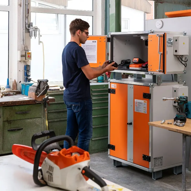 Szafka może służyć do ładowania nie tylko akumulatorów, ale również różnych urządzeń elektrycznych, takich jak np. sprzęty ogrodowe, laptopy czy tablety. To praktyczne oraz wygodne rozwiązanie, które można łączyć w różnych konfiguracjach wraz z pozostałymi szafami do składowania i ładowania baterii litowo-jonowych z serii LOCKEX.