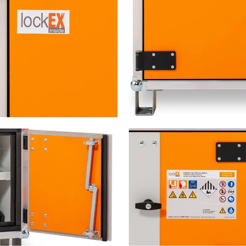 Szafa na akumulatory LOCKEX posiada 3 półki i specjalne uszczelki przeciwpożarowe uniemożliwiające ucieczkę płomieni oraz system dymoszczelny, zabezpieczający przed wydobyciem się dymu. Dołączone zostały do niej 2 czujniki dymu z alarmem akustycznym. Wyposażona jest też w kratę przeciwpożarową zapobiegającą wydostawaniu się płomieni i odłamków podczas eksplozji. Szafa posiada grube ściany co powoduje, że w przypadku pożaru alarm z czujnika wewnątrz byłby słabo słyszalny. Z tego powodu, producent dodał drugi czujnik, do umieszczenia na zewnątrz (detektory dymu komunikują się ze sobą bezprzewodowo).
