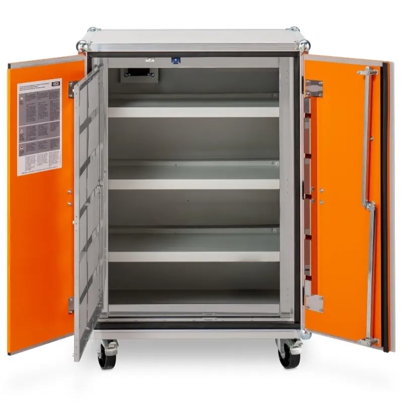 - Dwudrzwiowa szafa z kółkami do przechowywania baterii litowo-jonowych lub elektronarzędzi