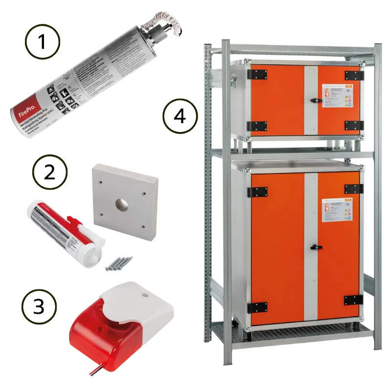 (1) Gaśnica aerozolowa (wydajność gaśnicza 0,25 m3) – skuteczny środek gaśniczy w aerozolu do akumulatorów litowo-jonowych, przeznaczony do wstępnego szybkiego gaszenia i tłumienia płomieni z automatycznym wyzwalaniem (bezobsługowy).