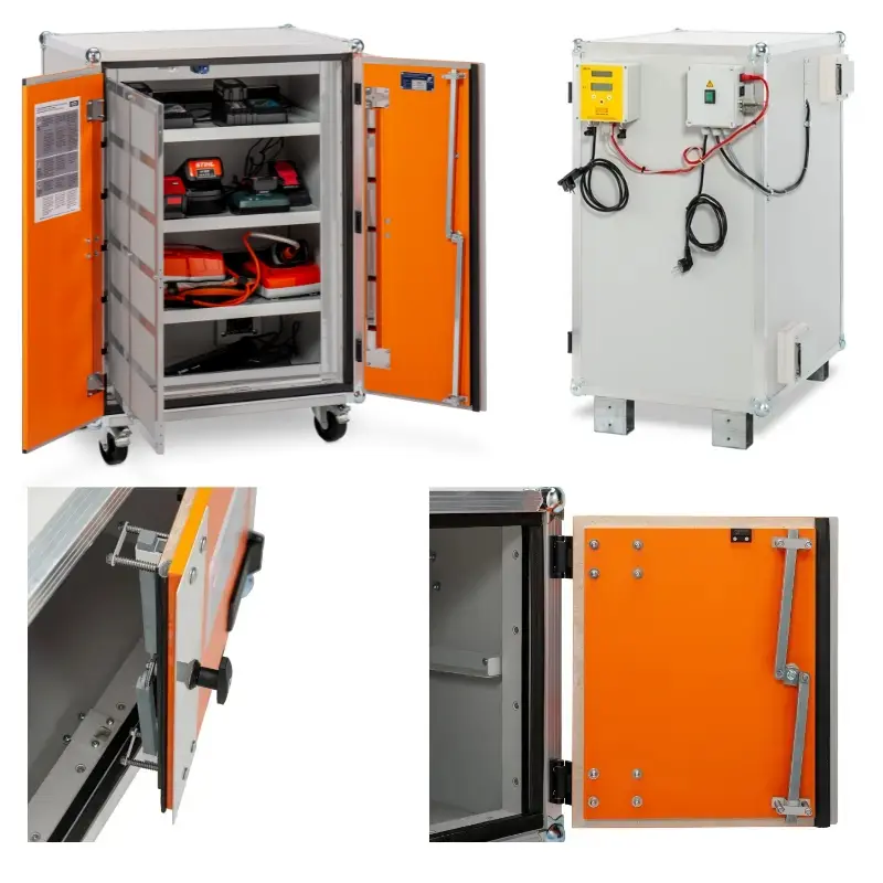 Szafka umożliwia ładowanie 18 akumulatorów lub urządzeń elektrycznych jednocześnie.  Została wyposażona w 2 listwy z 9 gniazdami wejściowymi (3500 W, 16 A) oraz przyłączenie do gniazda wyjściowego o mocy 230 V (wtyczka europejska). W trakcie procesu ładowania ciepło jest odprowadzane przez wbudowany wentylator. Szafa posiada 3 półki i antyogniowe uszczelki zapobiegające ucieczce płomieni oraz system dymoszczelny, zabezpieczający przed wydostaniem się dymu. Wyposażona jest też w kratę przeciwpożarową zapobiegającą wydostawaniu się płomieni i odłamków podczas eksplozji. Dołączony został detektor dymu. Czujnik jest podłączony elektrycznie (zamiast na baterie) i wykrywa zarówno ciepło, jak i dym.