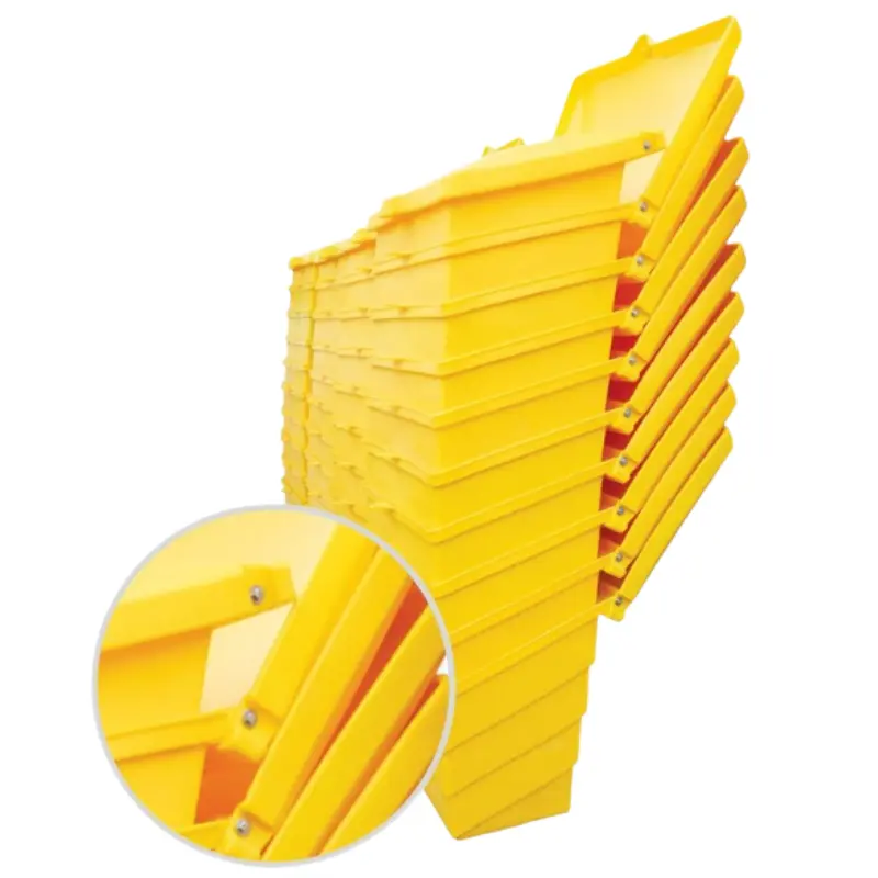 Skrzynia ICE BIN R 350 L została wykonana z wysokiej jakości polietylenu (PE), który charakteryzuje się dużą odpornością na uszkodzenia mechaniczne, odbarwienia, pękanie oraz działanie soli i substancji chemicznych. Polietylen jest materiałem w 100% recyklingowym, odpornym na wilgoć i łatwym do utrzymania w czystości. Dzięki temu pojemnik przez długi czas zachowuje estetyczny wygląd i wysoką funkcjonalność. Pojemniki zostały zaprojektowane tak, aby umożliwić piętrowanie. Pozwala to na magazynowanie i transport większej liczby skrzyń, oszczędzając przy tym miejsce na placach składowych. Konstrukcja skrzyni gwarantuje stabilność i bezpieczeństwo podczas ustawiania pojemników jeden na drugim.