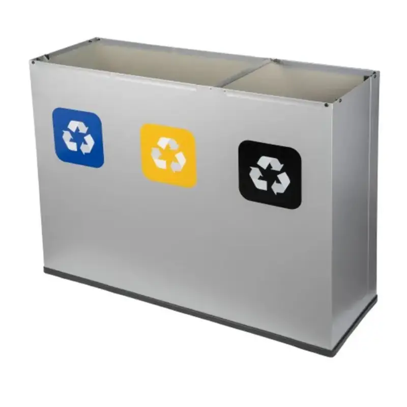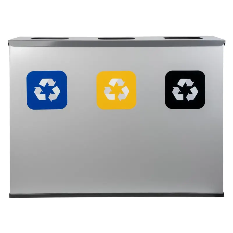 Minimalistyczny design sprawi, że idealnie wpasuje się w nowoczesne przestrzenie. Do stacji załączone są 3 kolorowe naklejki z nazwami frakcji odpadów w języku polskim i angielskim oraz kolorowe otwory wrzutowe, które pomagają w prawidłowej segregacji odpadów.