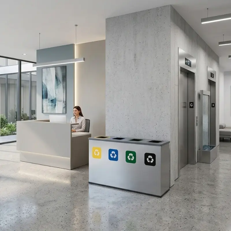 Jej minimalistyczny design sprawia, że świetnie wpasuje się w nowoczesną architekturę. Do stacji załączone są 4 kolorowe naklejki z nazwami frakcji odpadów w języku polskim i angielskim oraz kolorowe otwory wrzutowe, które pomagają w prawidłowej segregacji odpadów.Potrzebujesz stacji do segregacji np. z frakcją bio? Napisz do nas na biuro@ekofabryka.com.pl, a my stworzymy dla Ciebie ofertę.