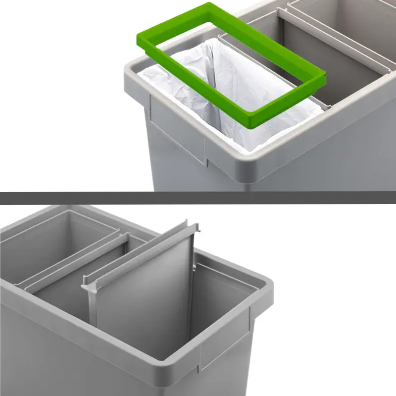 Do każdej komory pojemnika montowana jest wysuwana przegroda, która umożliwia oddzielenie frakcji odpadów. Co więcej, dzięki temu, że przegrody są łatwe do wyjęcia, cały pojemnik można łatwo umyć z wszelkich zabrudzeń. Wieko każdej z komór otwiera się oddzielnie przy pomocy wpuszczanego uchwytu. Każda pokrywa kosza chroni przed przedostawaniem się przykrych zapachów z wewnątrz kosza. Dodatkowo, każda komora ma aż 13 litrów na pomieszczenie konkretnego odpadu, co jest wystarczającą ilością miejsca na gromadzenie odpadów przez około tydzień w jednoosobowym gospodarstwie domowym.